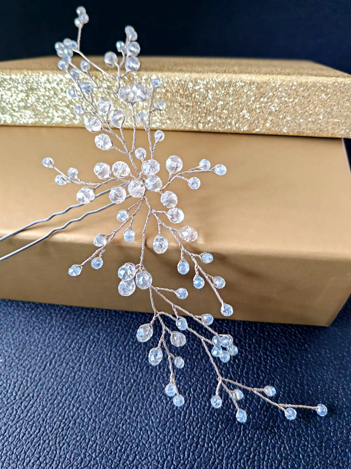 Accesoriu de par pentru mireasa, realizat manual in totalitate, unicat. Creat din fir fin placat cu argint, modelat delicat in ramuri florale, decorat cu cristale fatetate de 4 mm ce capteaza lumina intr-un joc subtil de reflexii si cristale de 6 mm pentru un plus de rafinament.