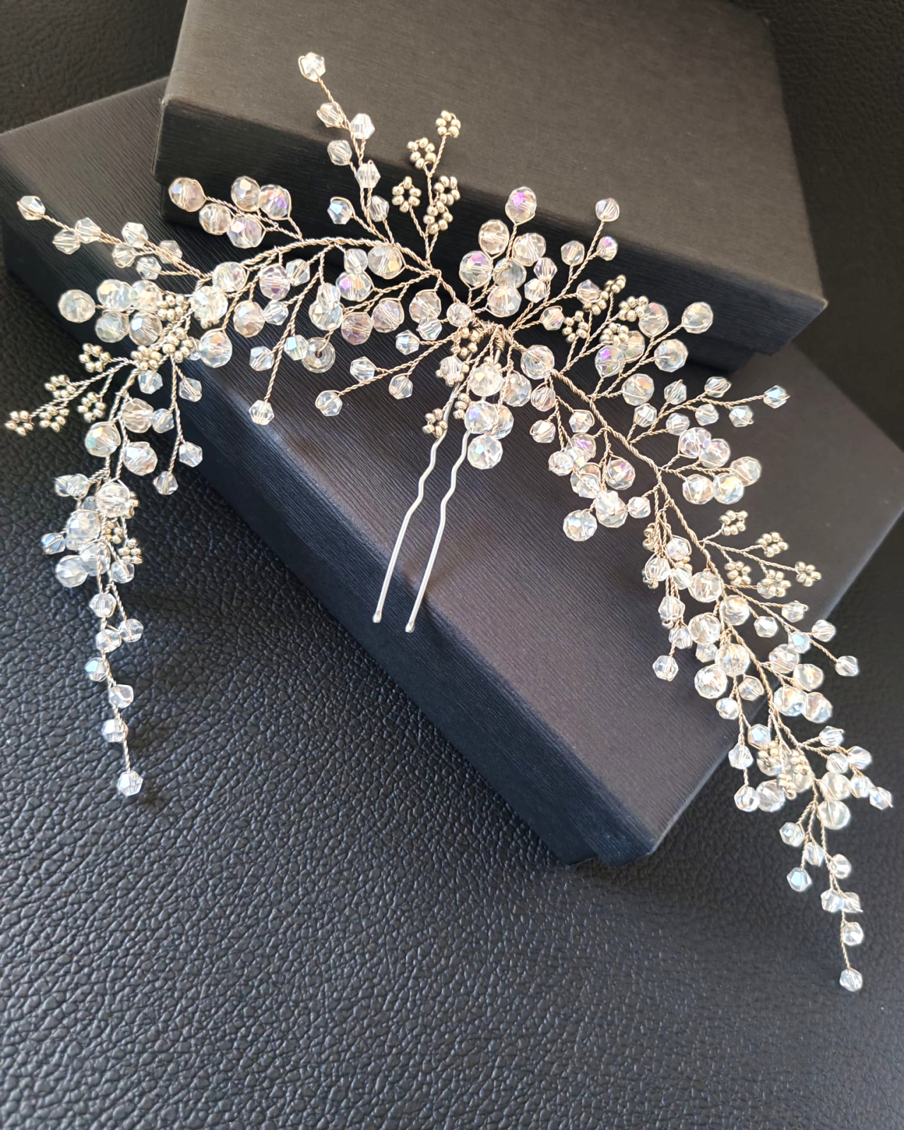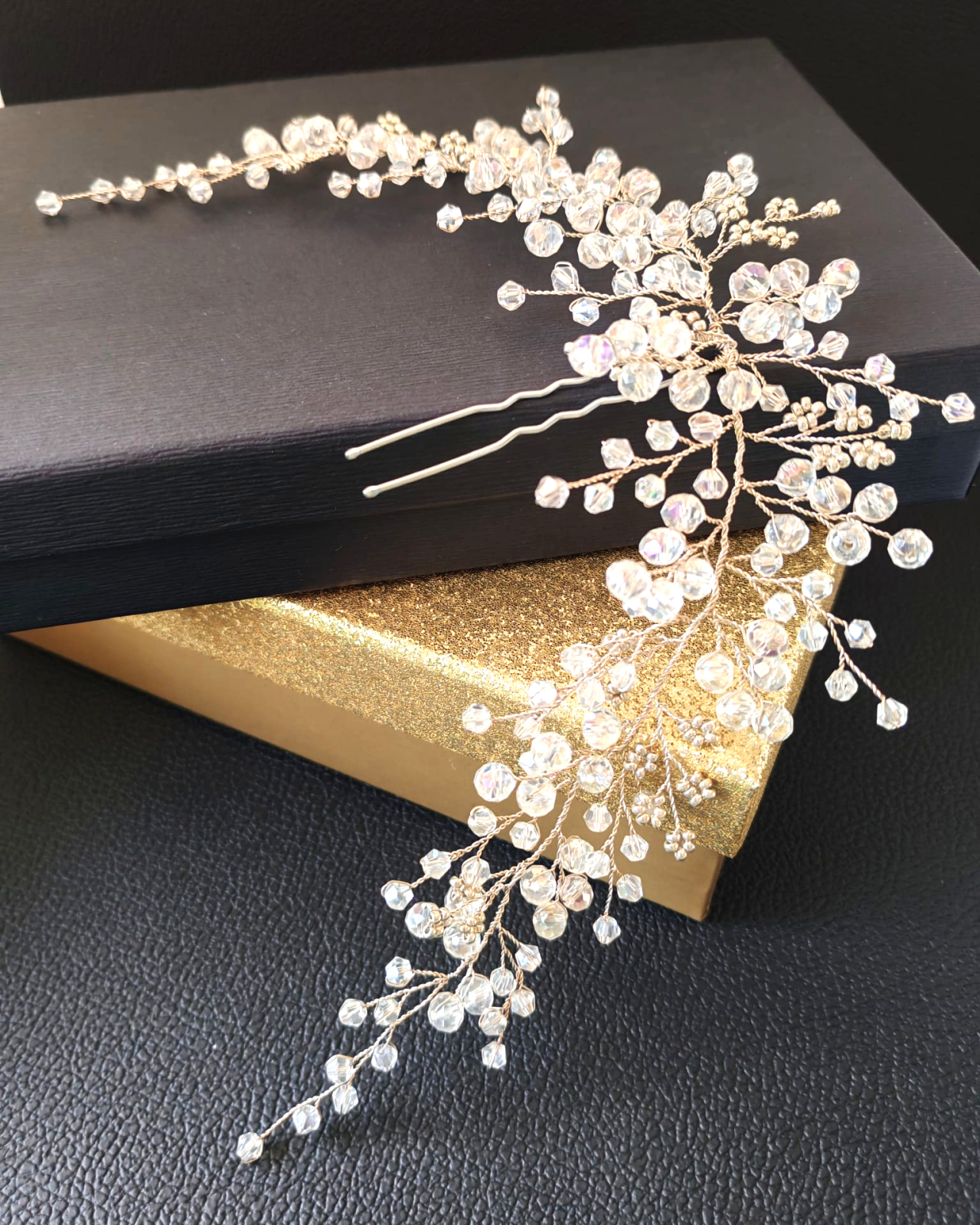 Un accesoriu de par ca o soapta de lumina, creat exclusiv manual pentru mireasa care isi poarta emotia în detalii. Firul placat cu argint se unduieste delicat, imbratisand cristalele transparente ce stralucesc asemenea picaturilor de roua in zori. Fiecare reflex prinde lumina intr-un dans subtil, completand coafura cu gratie si rafinament. O bijuterie de par menita sa spuna o poveste de iubire, purtata intr-o zi ce va ramane veșnic.