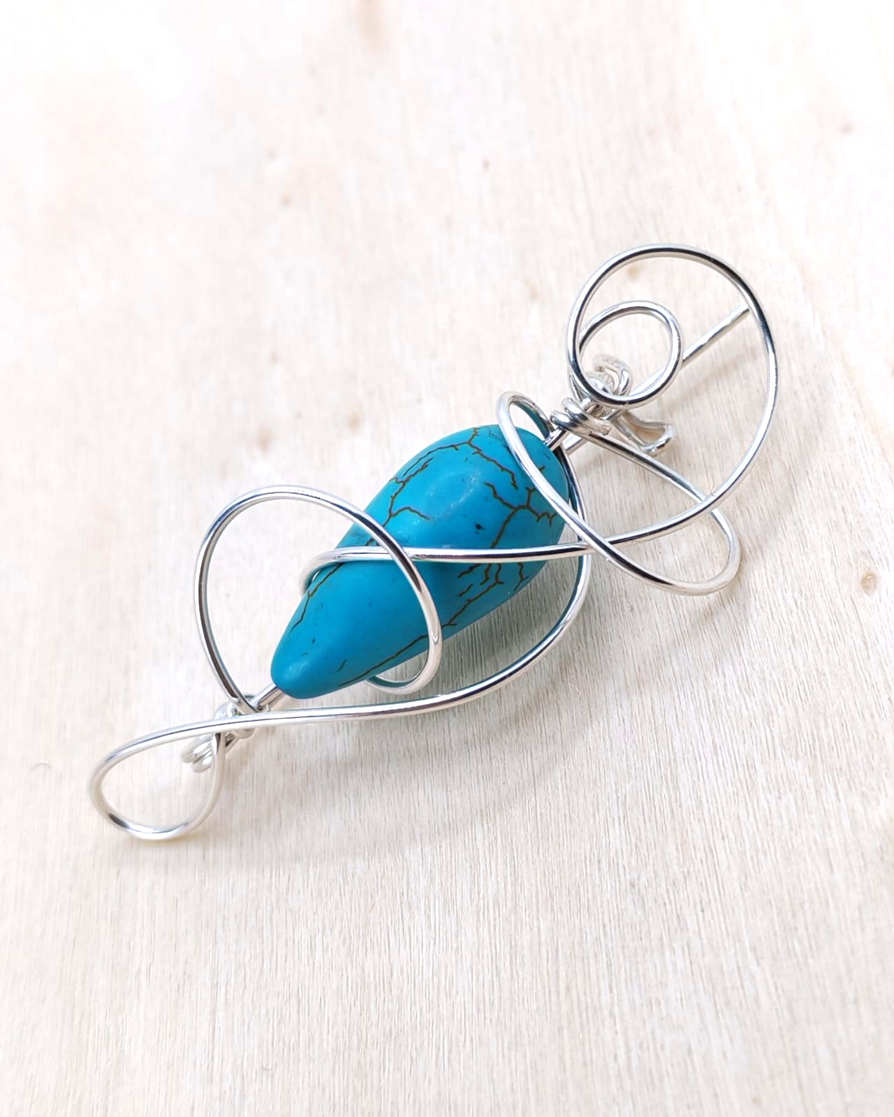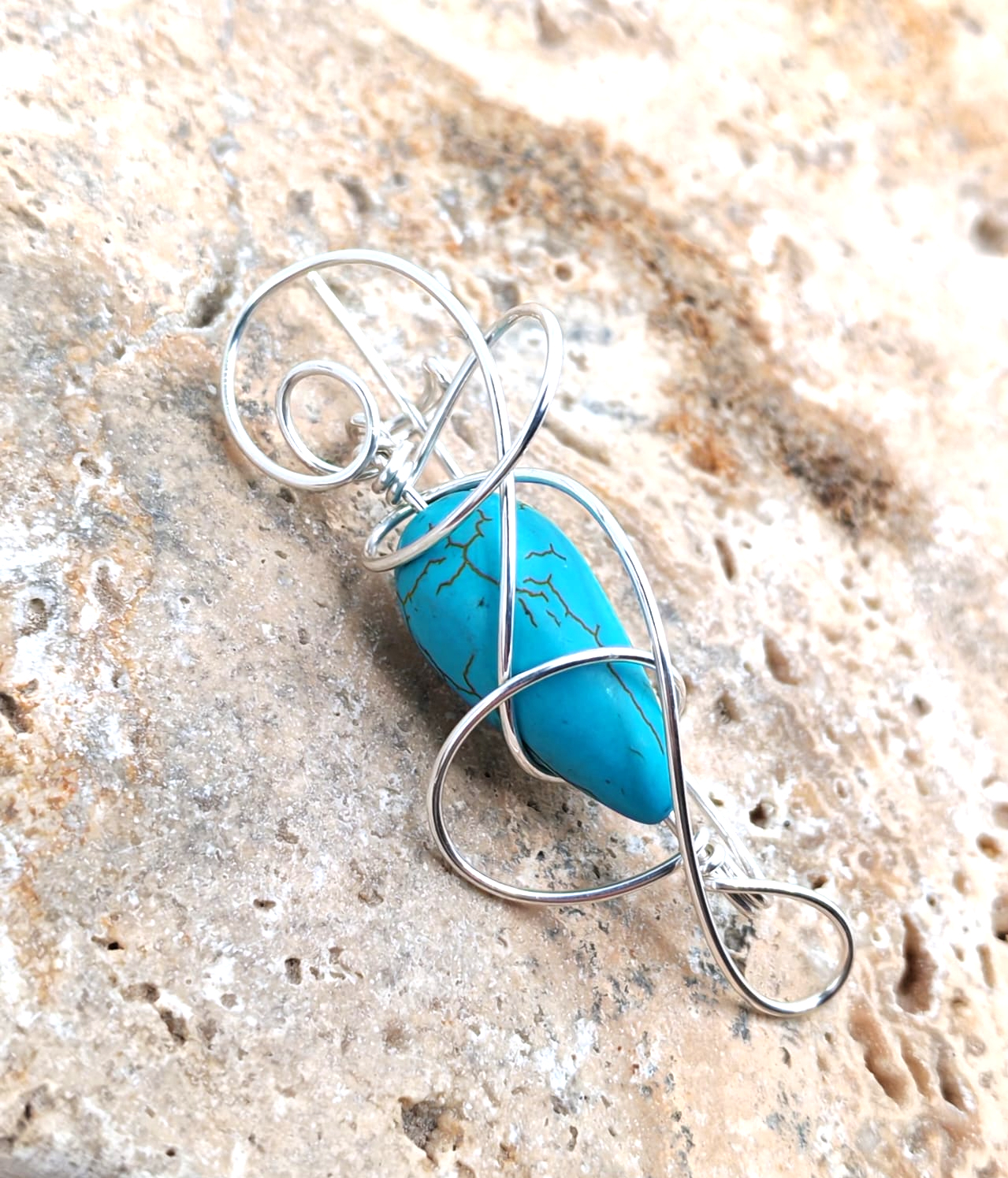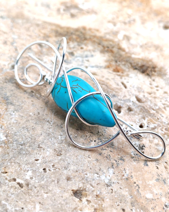 Turcoazul este considerat piatra libertatii, a comunicarii si a protectiei. Se spune ca aduce noroc si energie pozitiva, fiind purtat din cele mai vechi timpuri ca talisman. Culoarea sa vibranta aminteste de cerul senin si de mare, transformand brosa intr-un accesoriu expresiv, perfect pentru tinute boeme sau pentru a anima o piesa vestimentara simpla. Firul placat cu argint Imbraca armonios piatra de turcoaz in forma de lacrima.