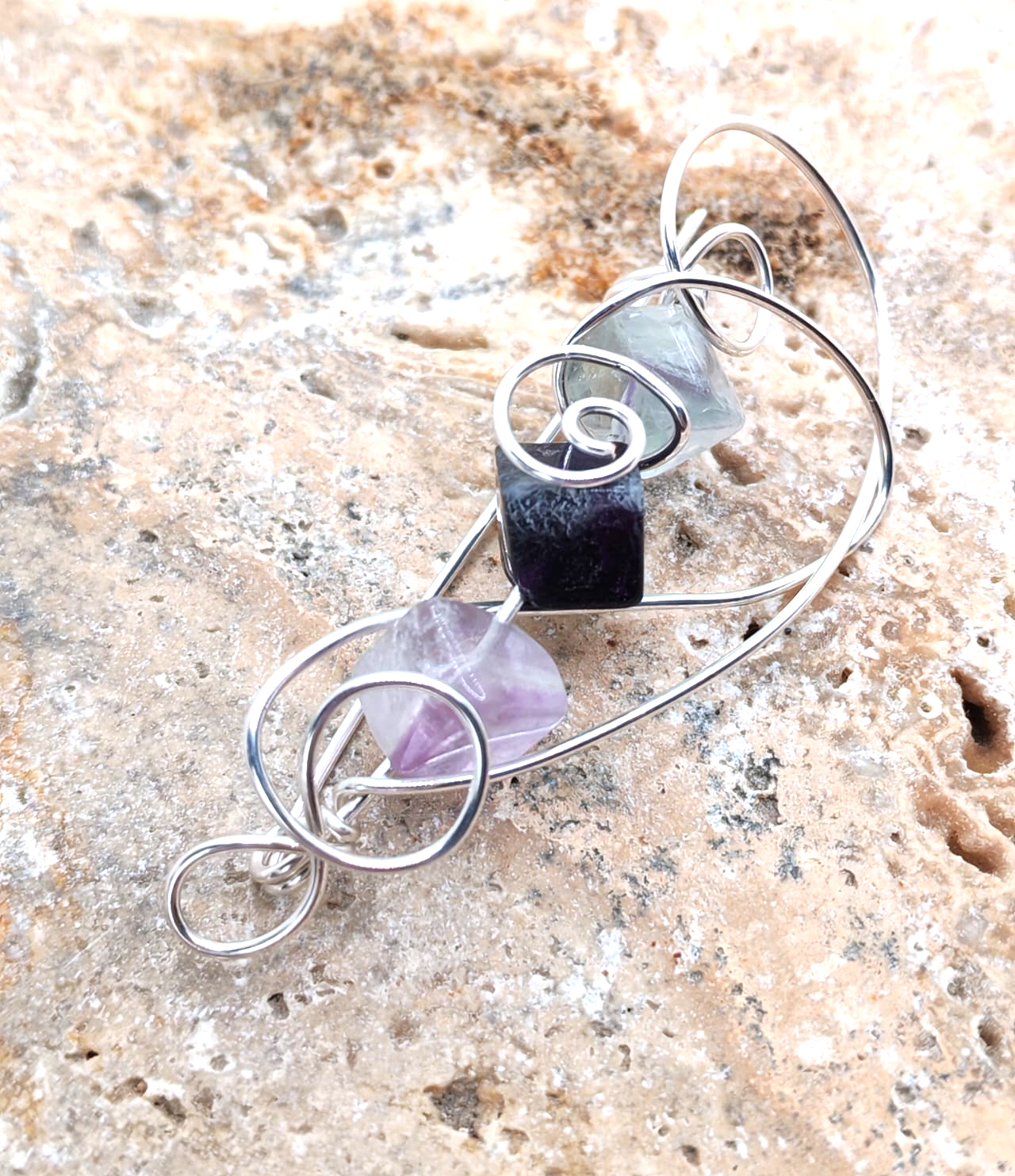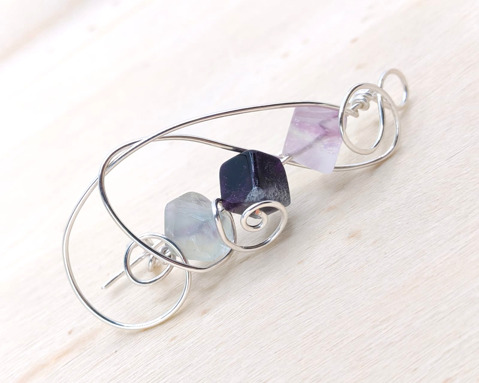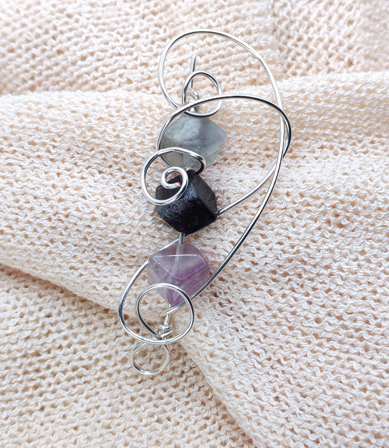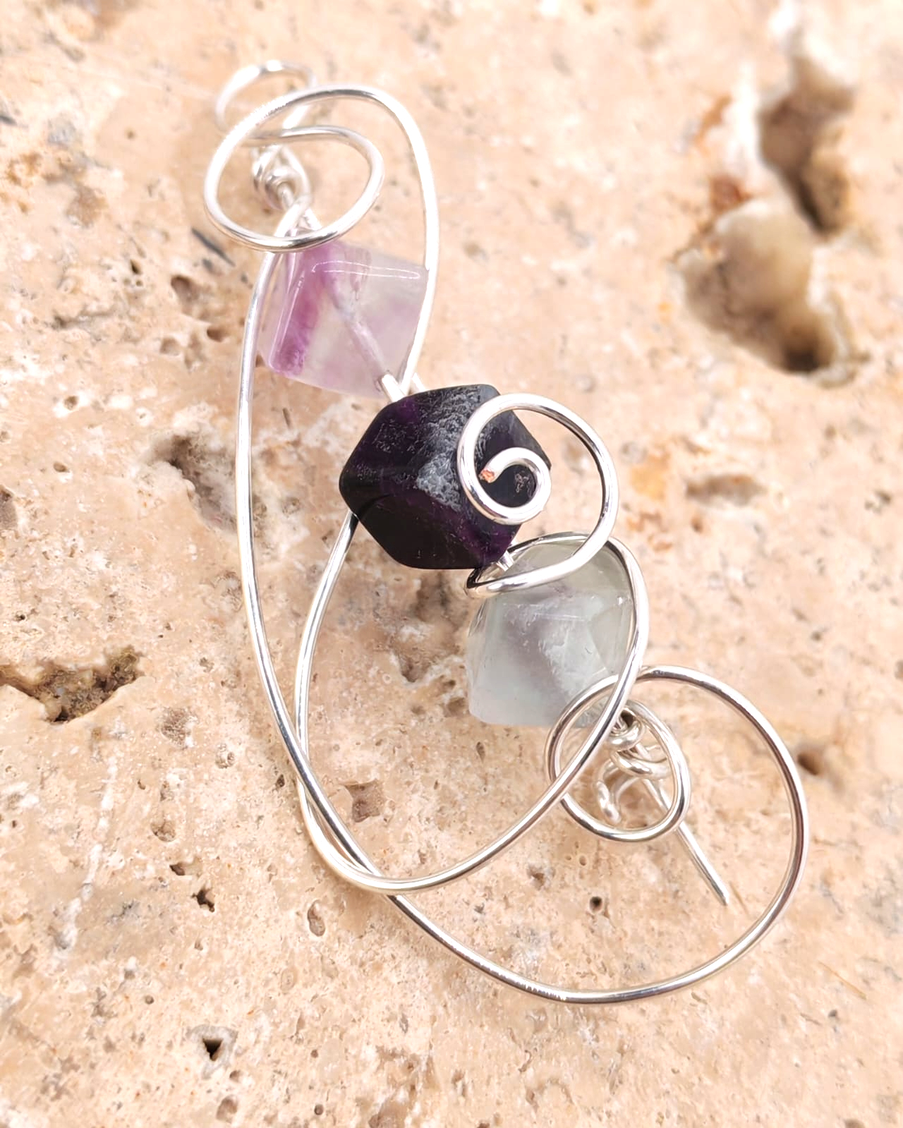 Brosa unicat, lucrata manual fara tipare, realizata din margele din pietre semipretioase naturale de fluorit si impletite cu grija pe fir placat cu argint. Designul imbina geometria moderna cu delicatetea lucrului artizanal, creand o piesa eleganta, cu linii curate si reflexii subtile de culoare. Cuburile de fluorit se asaza armonios, formand un joc vizual rafinat, potrivit atat pentru tinute de zi, cat si pentru aparitii speciale. Firul placat cu argint oferă rezistenta si un plus de stralucire, punand in valoare nuantele naturale ale pietrei.
