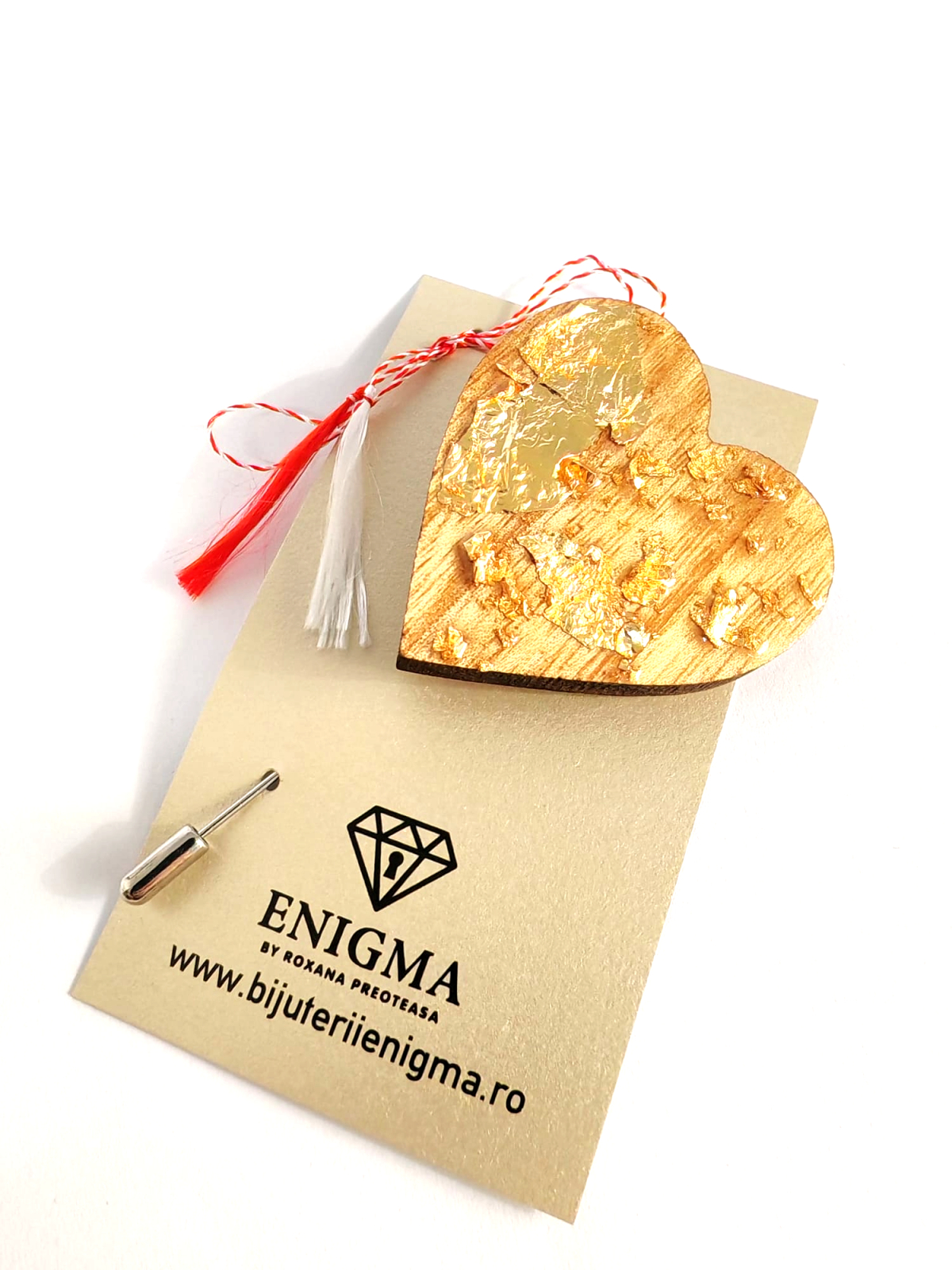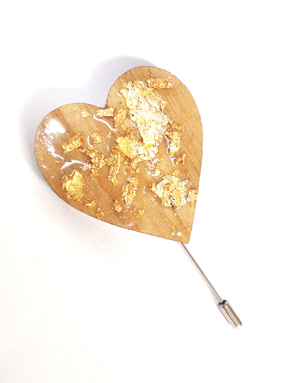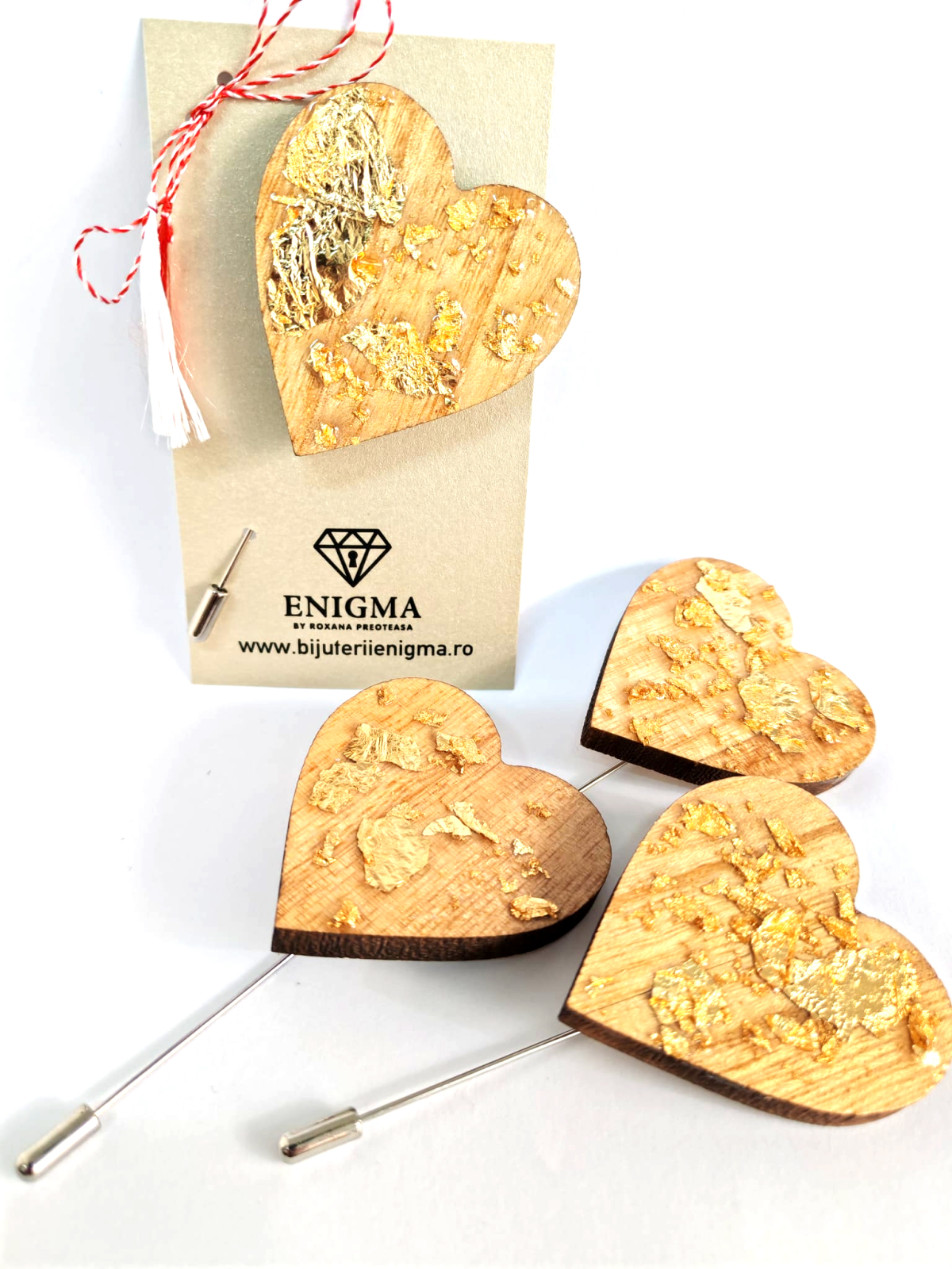 Accesoriul este prevazut cu un ac de brosa metalic rezistent, ușor de prins pe haine, esarfe sau genti. Fiecare brosa este unică datorita texturii naturale a lemnului si distributiei foitei de aur, devenind astfel o mica opera de arta purtabila — perfecta pentru cei care apreciaza frumusetea obiectelor handmade.