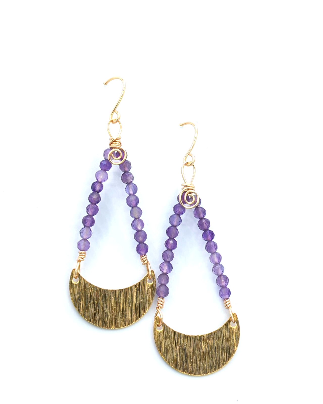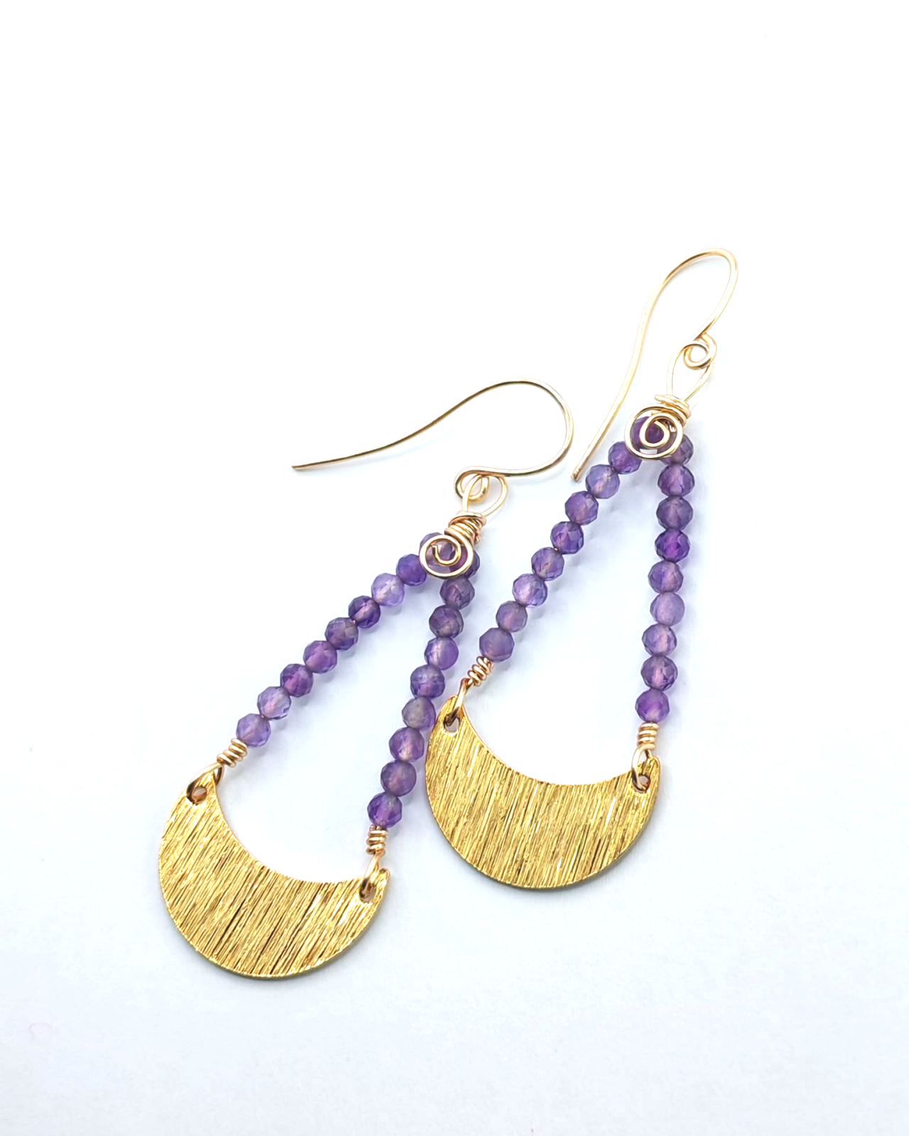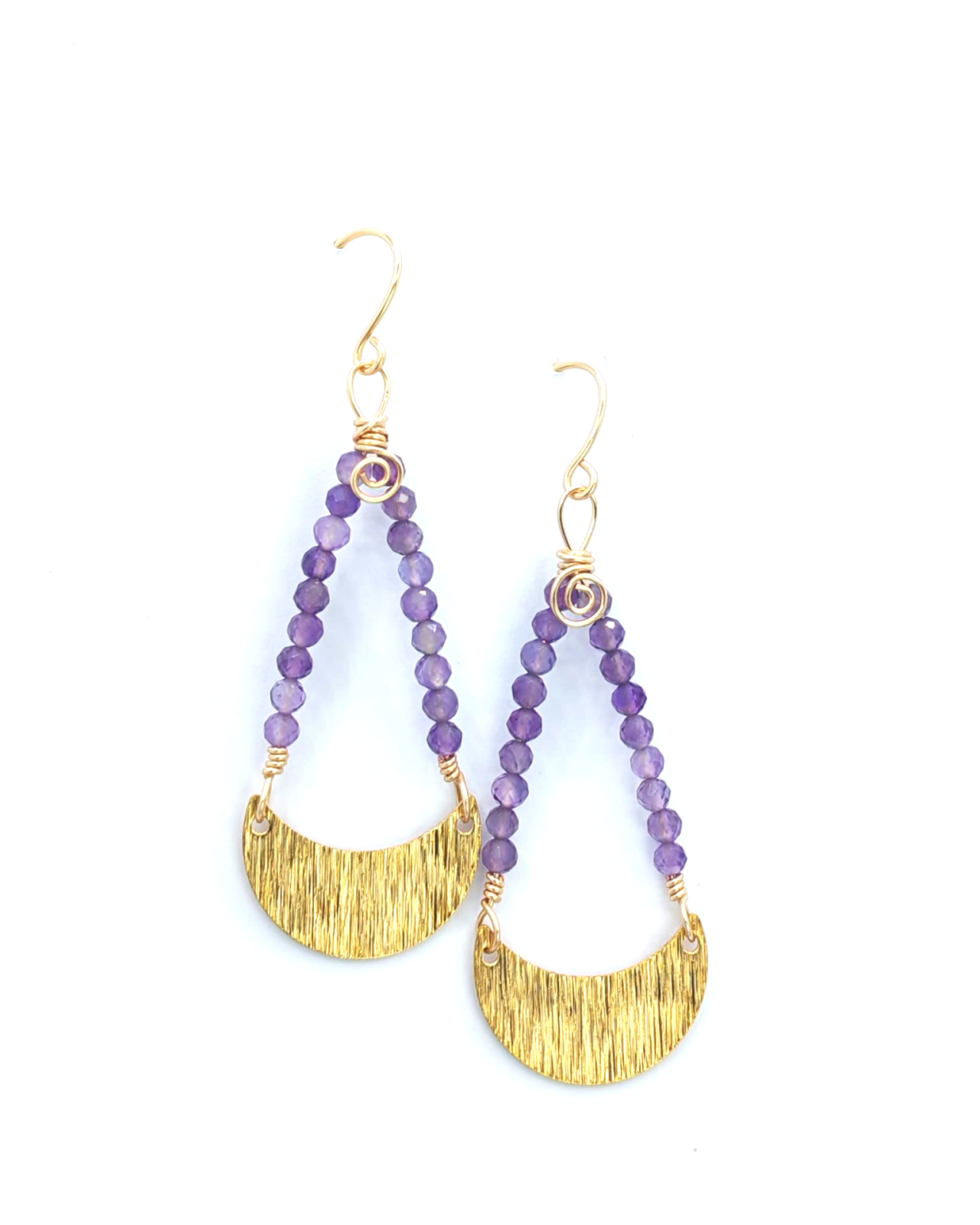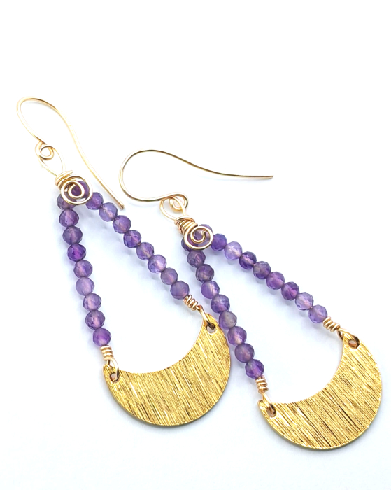 Cercei eleganti cu semiluna aurie, realizati manual, cu un design inspirat de simbolistica feminitatii si a echilibrului. Elementul central este o semiluna din alama aurie, completata armonios de pietre naturale de ametist, apreciate pentru nuantele lor vibrante de mov si energia lor aparte.