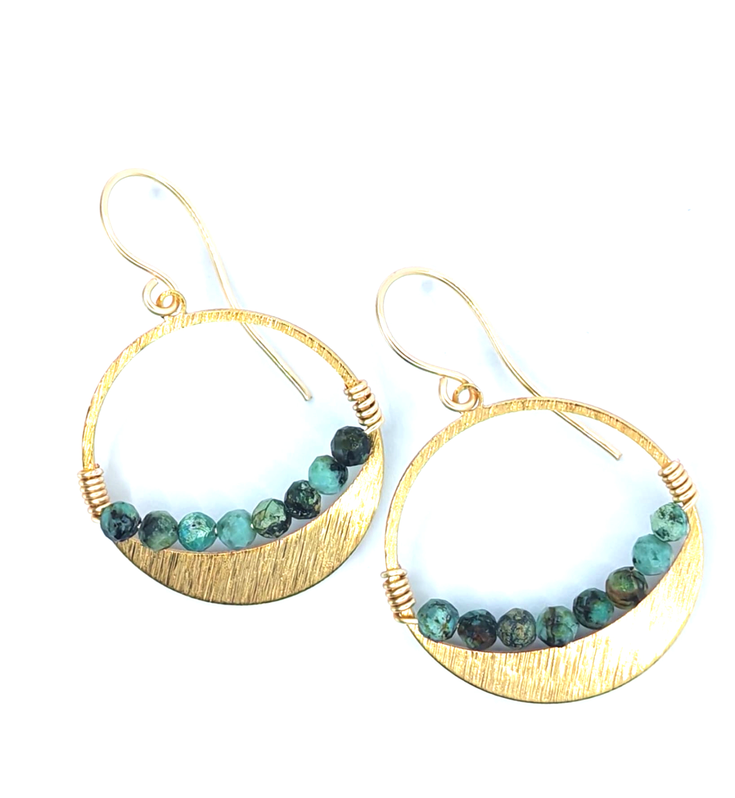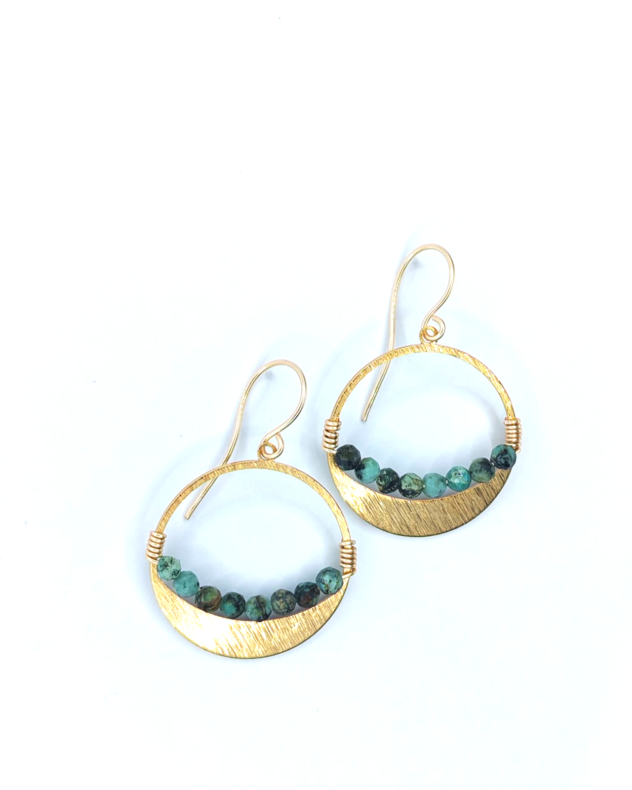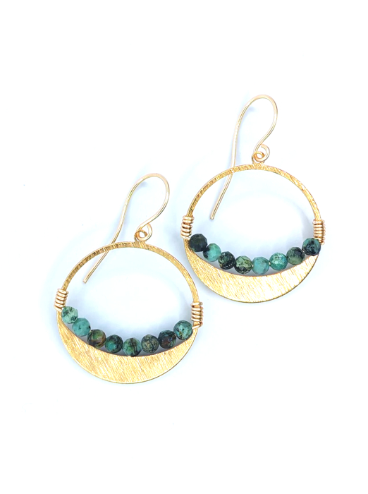 Cercei rotunzi din alama aurie, realizati manual, cu un design echilibrat si atemporal. Forma circulara simbolizeaza armonia si continuitatea, fiind pusa in valoare de pietrele naturale de turcoaz african, ale caror nuanțe vibrante adauga prospetime si personalitate piesei.
