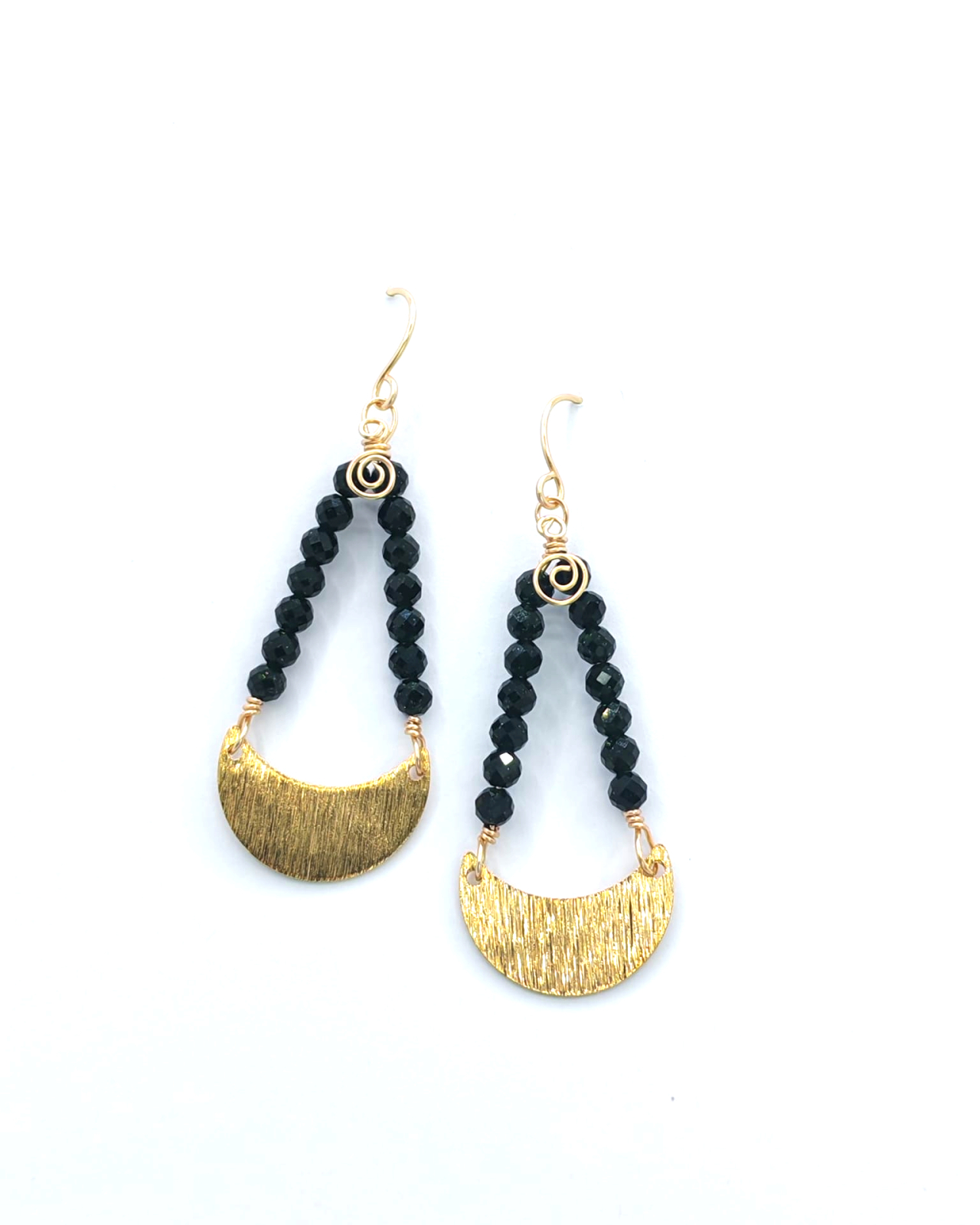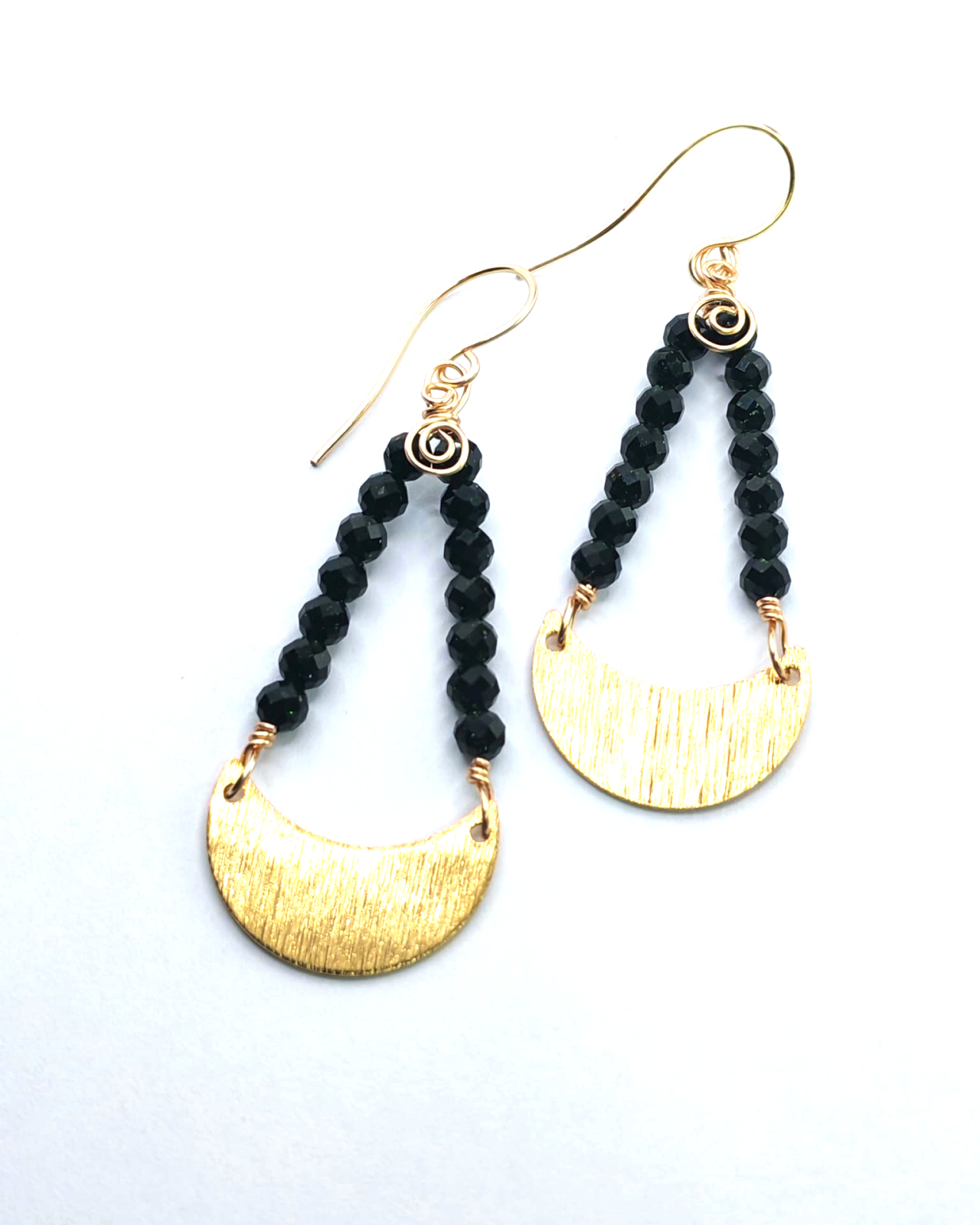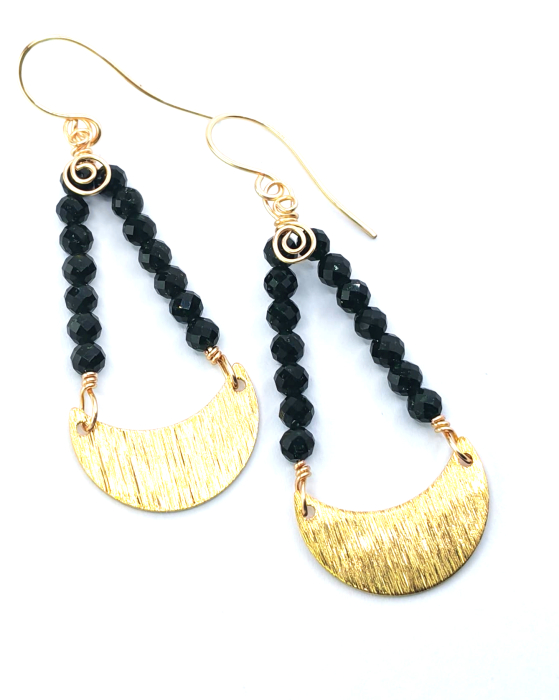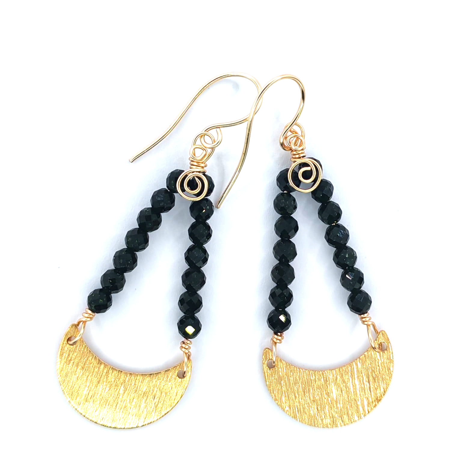 Cercei eleganti cu semiluna aurie, realizati manual, cu un design inspirat de simbolistica feminitatii si a echilibrului. Elementul central este o semiluna din alama aurie, completata armonios de margelute de piatra soarelui verde inchis, apreciate pentru stralucirea lor discreta si energia lor aparte.