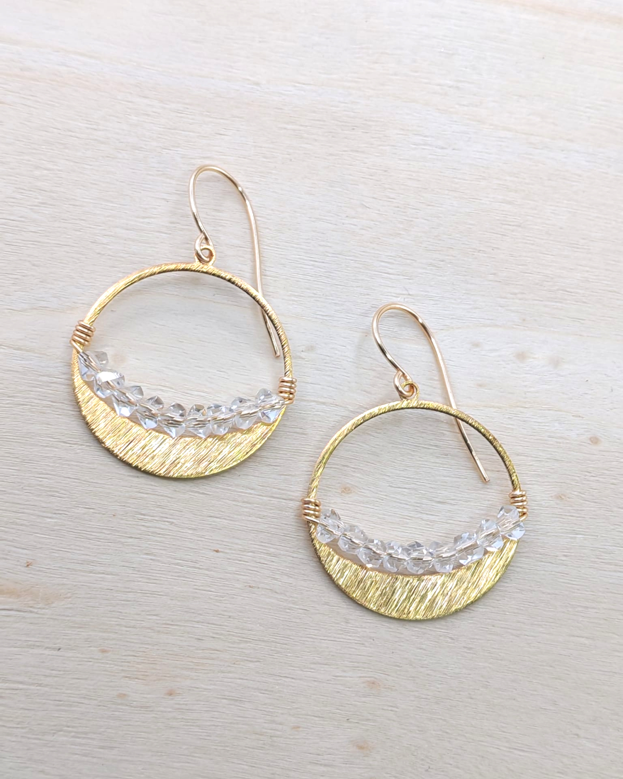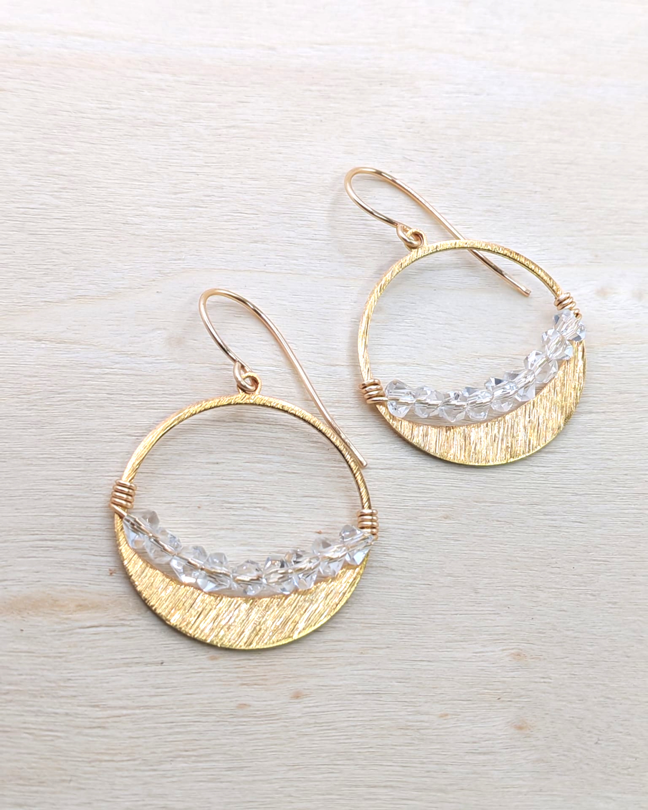 Cercei rotunzi din alama aurie, realizati manual, cu un design echilibrat si atemporal. Forma circulara simbolizeaza armonia si continuitatea, fiind pusa in valoare de cristalele fatetate in forma triunghiulara, ale caror straluciri adauga prospetime si personalitate piesei.