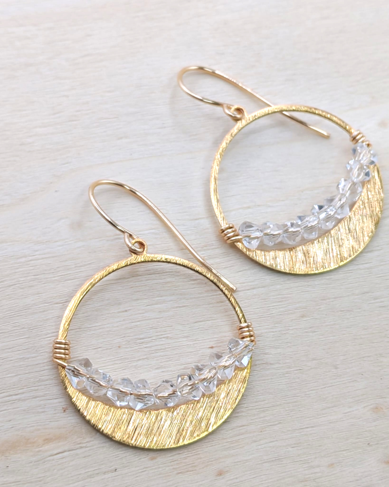 Cerceii sunt prevazuti cu tortita modelata manual din fir non-tarnish, placat cu argint si emailat auriu, oferind confort la purtare, durabilitate si un finisaj elegant. Contrastul dintre auriul cald al alamei si stralucirea margelelor creeaza un accesoriu versatil, usor de integrat atat in tinute casual-chic, cat si in aparitii rafinate.