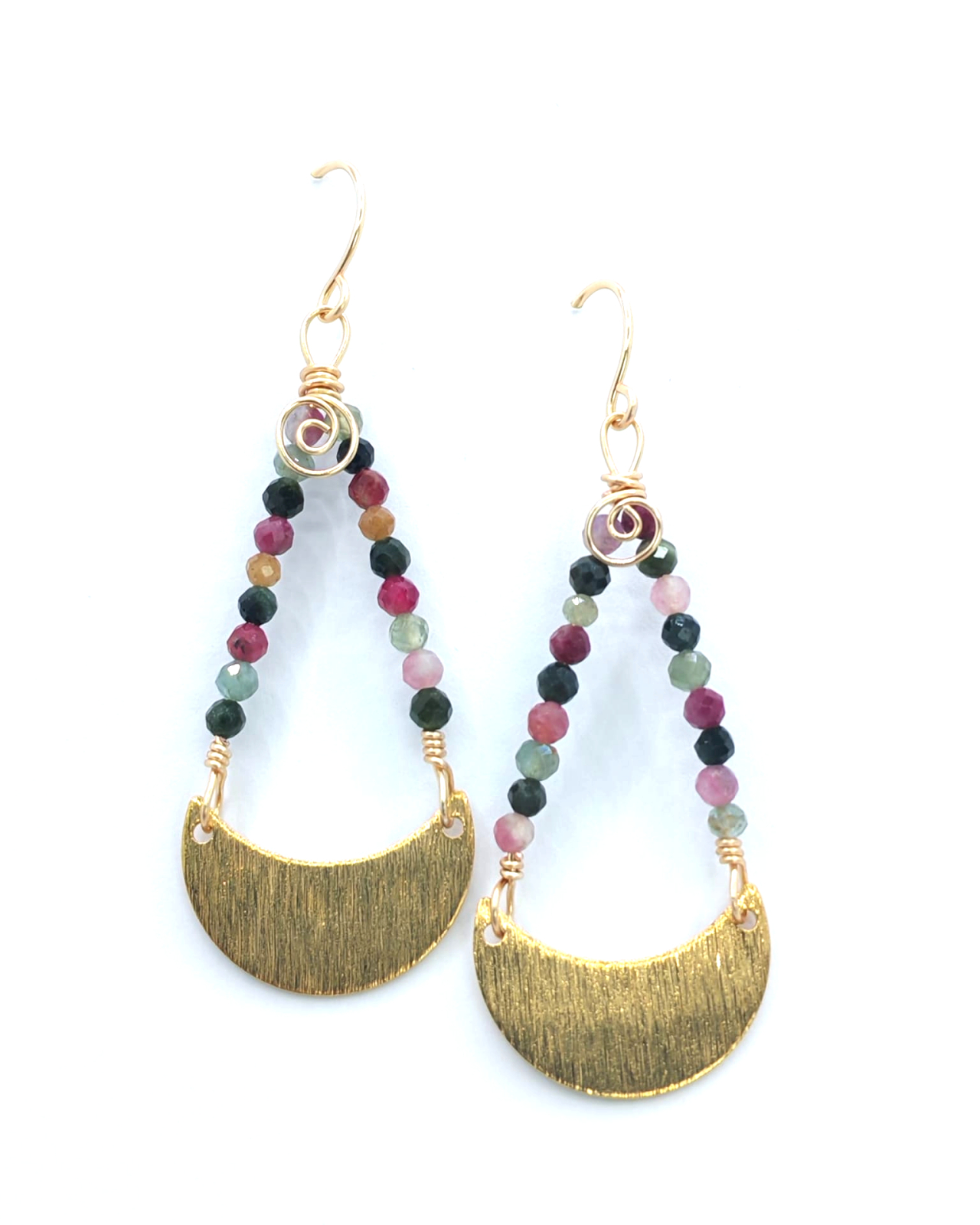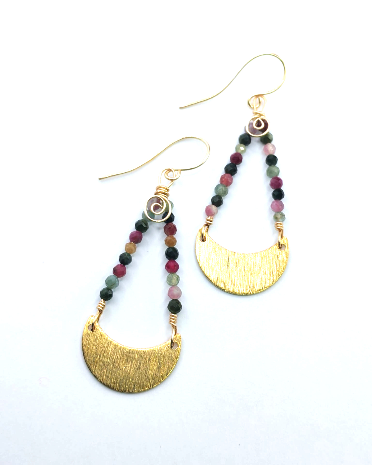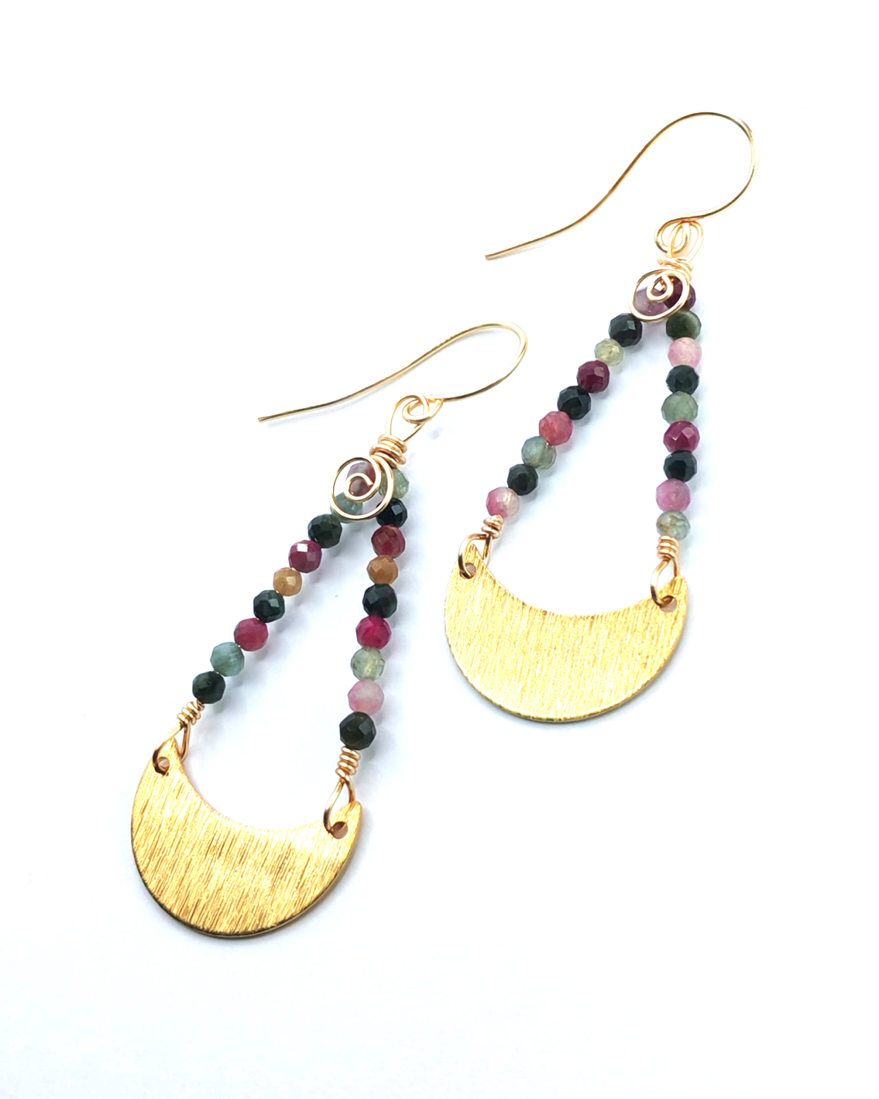 Cercei eleganti cu semiluna aurie, realizati manual, cu un design inspirat de simbolistica feminitatii si a echilibrului. Elementul central este o semiluna din alama aurie, completata armonios de pietre naturale de turmalina multicolora, apreciate pentru nuantele lor vibrante si energia lor aparte.