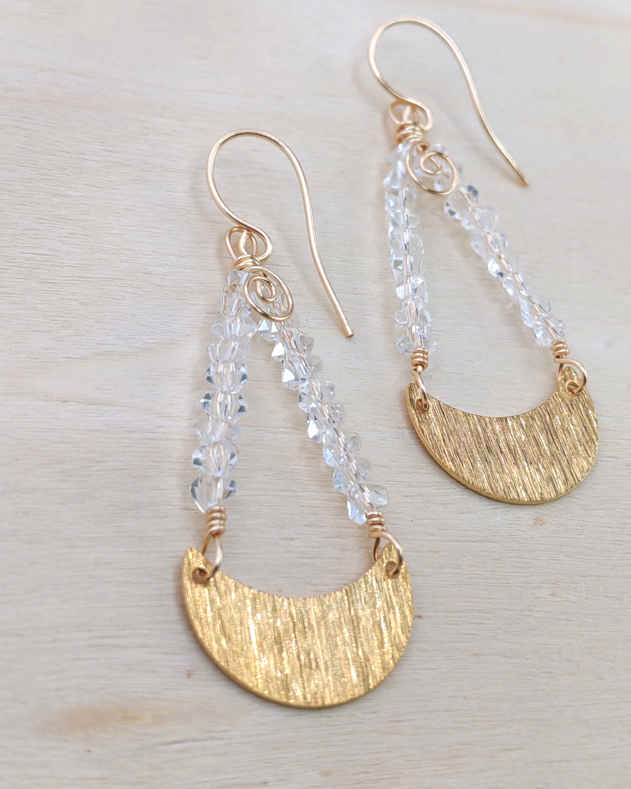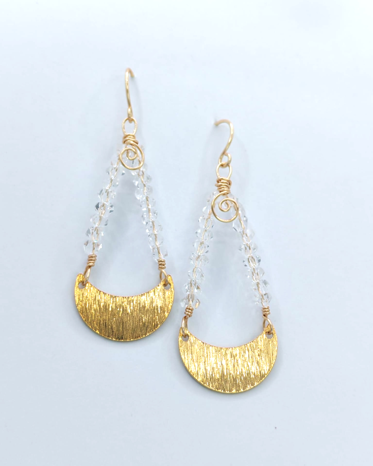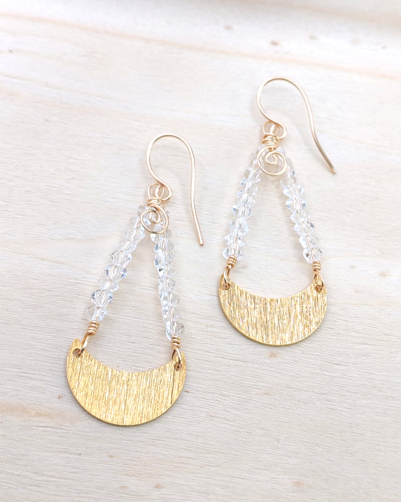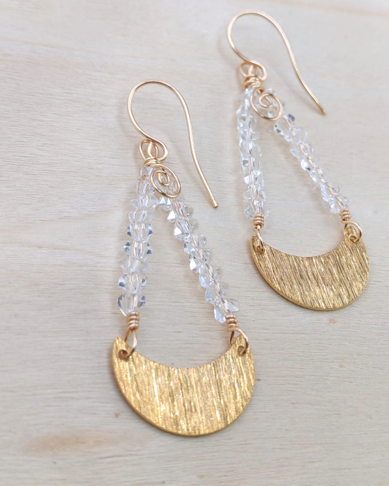 Cercei eleganti cu semiluna aurie, realizati manual, cu un design inspirat de simbolistica feminitatii si a echilibrului. Elementul central este o semiluna din alama aurie, completata armonios de cristalele transparente in forma triunghiulara, apreciate pentru stralucirea data de fatetele lor.