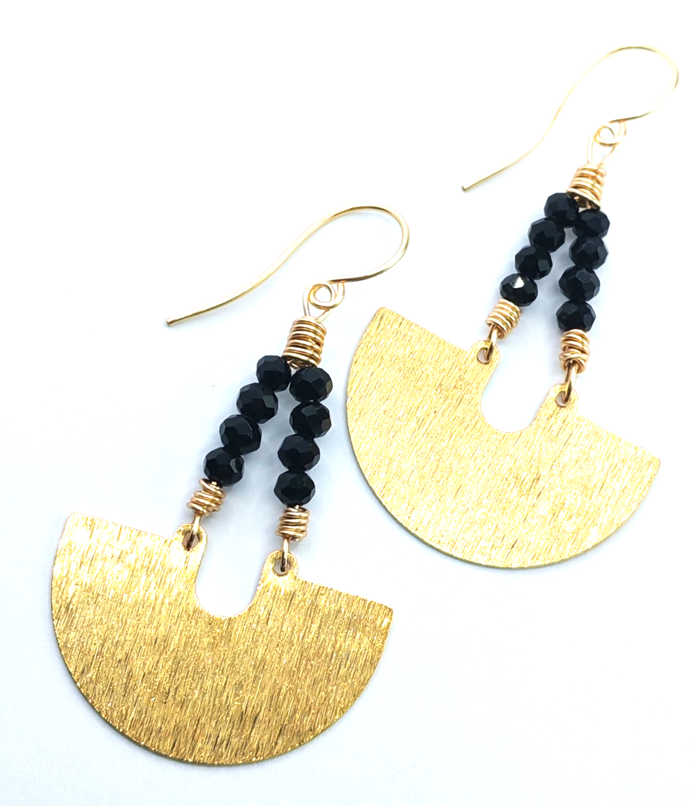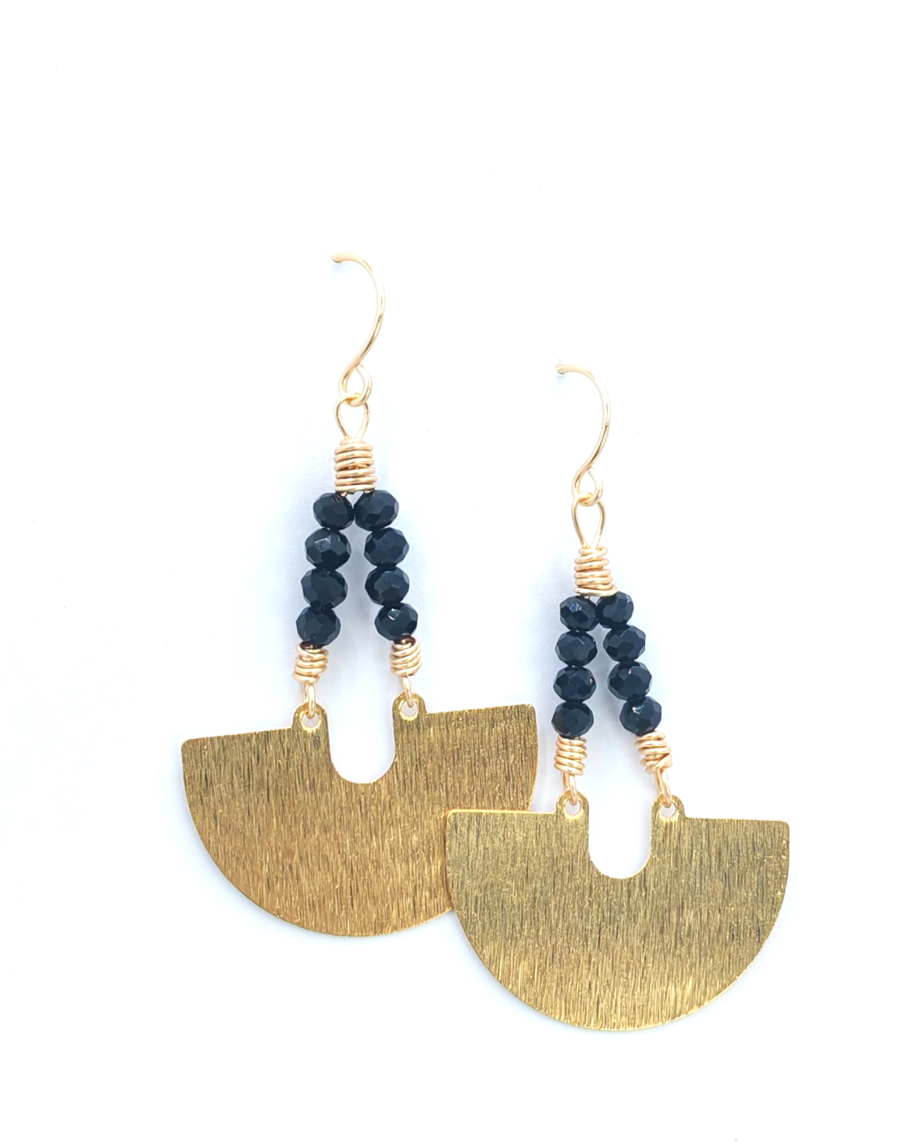 Acesti cercei cu componente din alama in forma de semiluna si cristale fatetate negre imbina armonios eleganta cu un aer boem si misterios. Forma de semiluna, simbol al feminitatii si al transformarii, adauga un plus de personalitate, in timp ce cristalele fatetate capteaza privirea la fiecare miscare, oferind stralucire si rafinament.