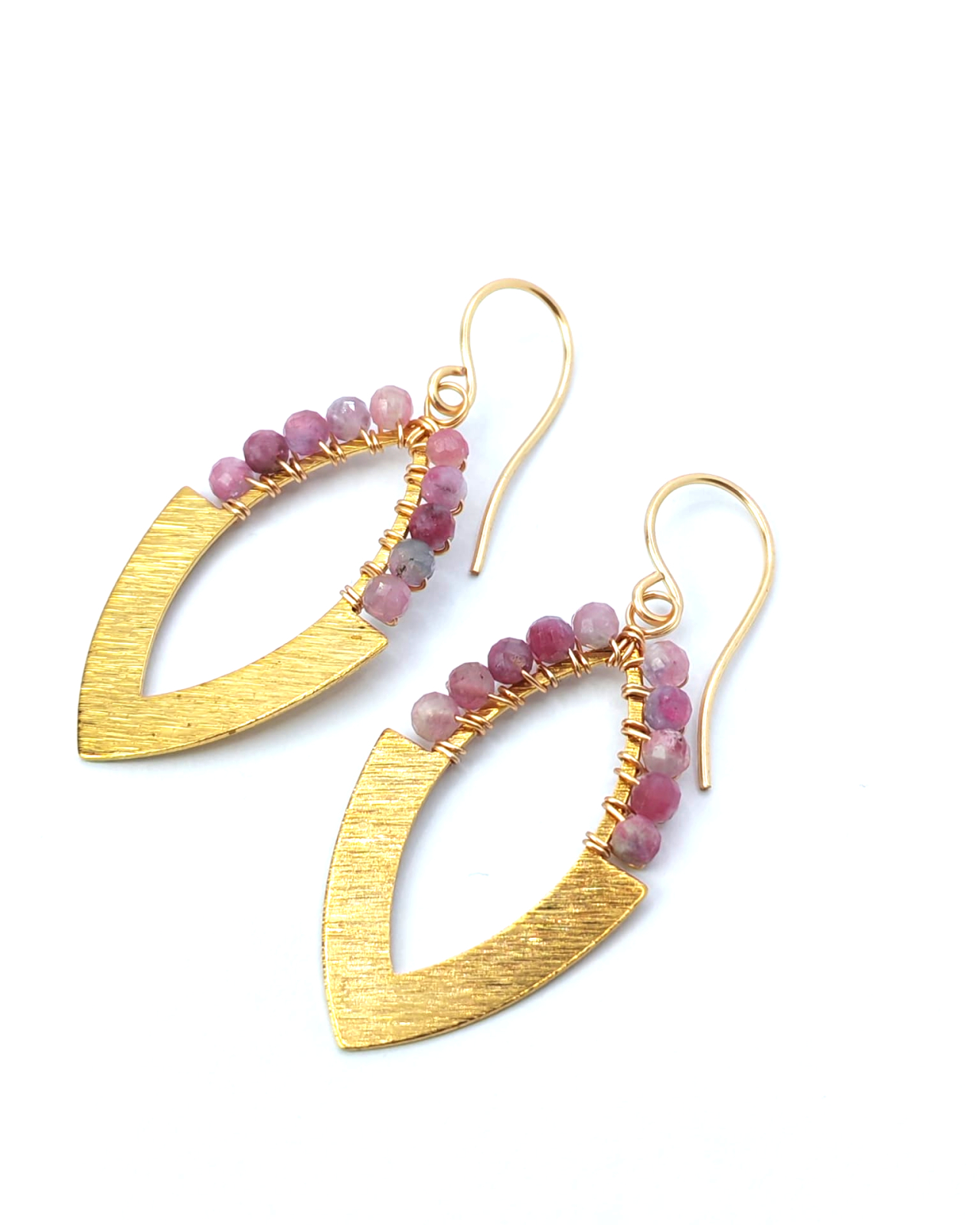Delicati si emotionali, cerceii Pinky cu turmalina roz vorbesc despre iubire, blandete si reconectare cu sinele. Realizati manual din alama si completati cu tortite din fir auriu, acestia emana o eleganta subtila. O bijuterie purtata ca un simbol al inimii deschise.