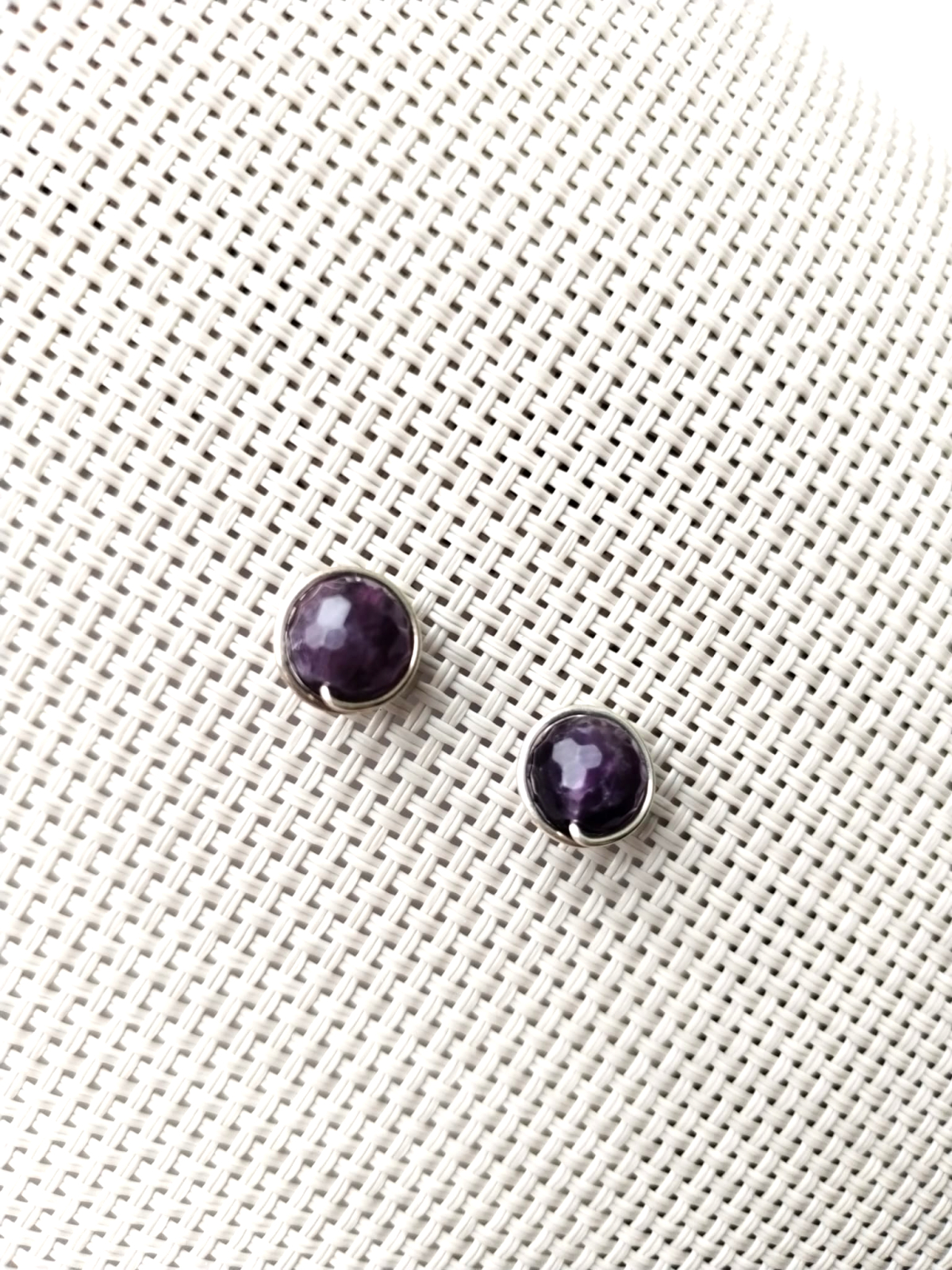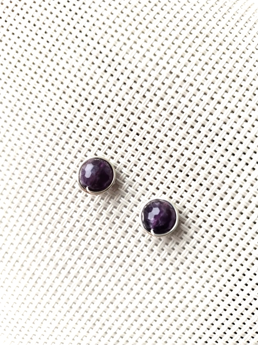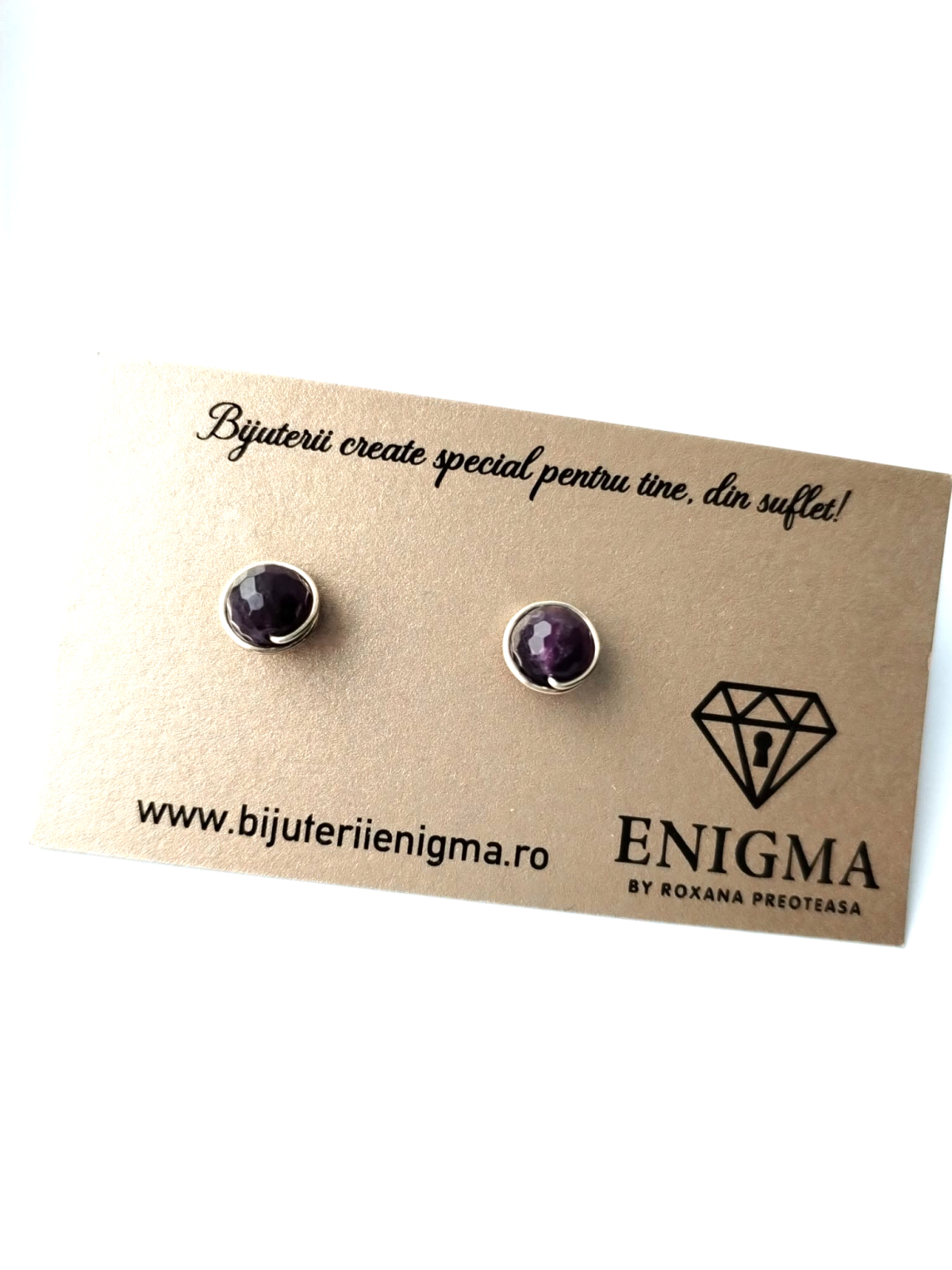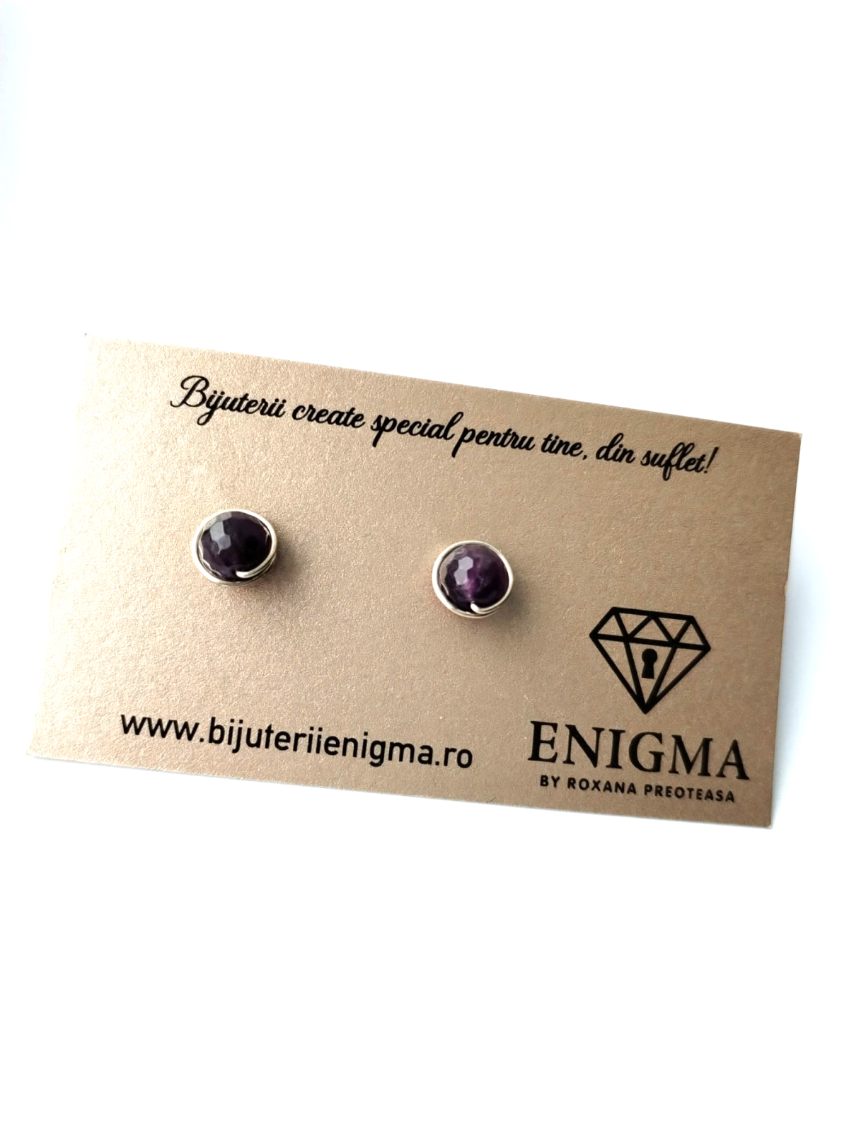 Cercei delicati, pe lobul urechii, lucrati manual cu pietre semipretioase naturale de ametist de 8 mm, fatetat, si arma modelatoare de cupru placat cu argint.