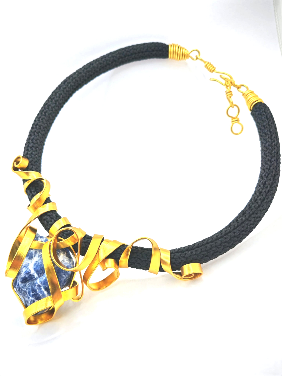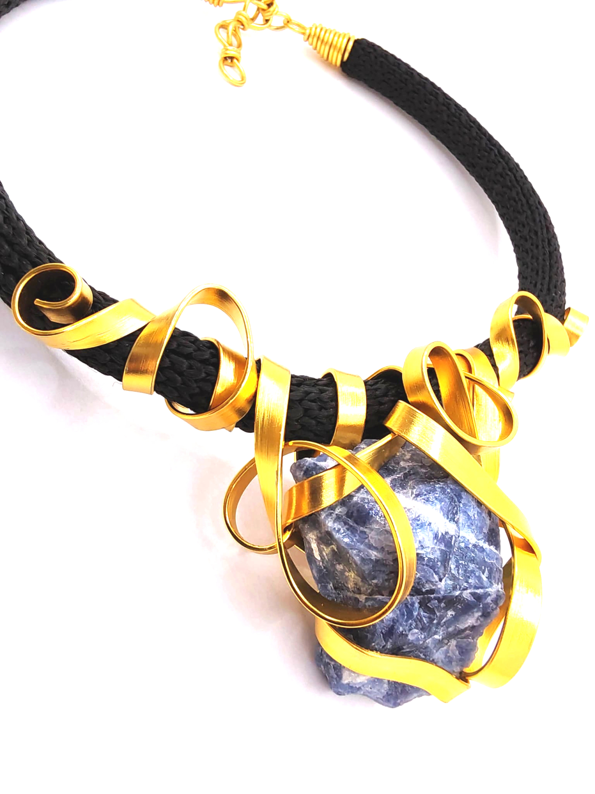 Colier Blue Lagoon - Colier unicat, lucrat manual din funie neagra, pusa in contrast cu piatra bruta de sodalit și accentele moderne ale benzilor de aluminiu auriu