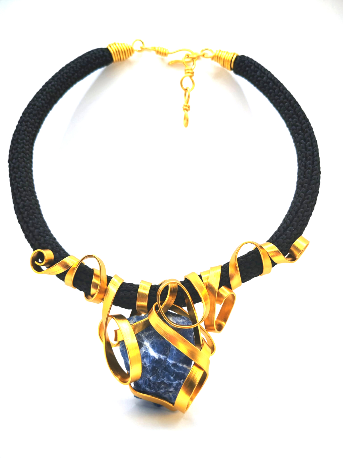 Pentru ca femeile cu personalitate puternica poarta bijuterii statement, am creat un colier unicat, lucrat manual din funie neagra, pusa in contrast cu piatra bruta de sodalit și accentele moderne ale benzilor de aluminiu auriu. Designul imbina forta bruta a materialelor cu o estetica contemporana, rezultand o piesa expresiva, cu personalitate. Un accesoriu care atrage privirea si spune o poveste despre echilibru, energie si originalitate.