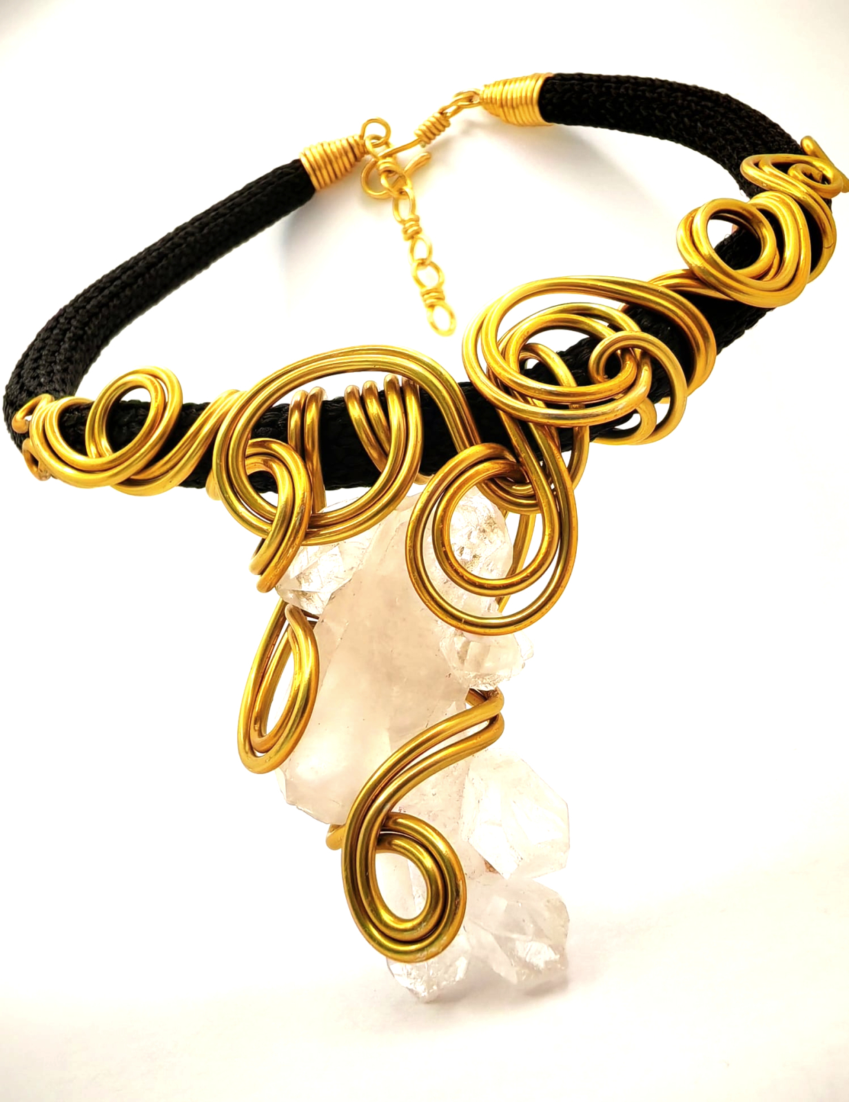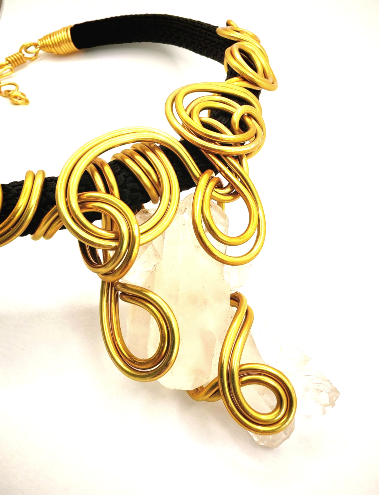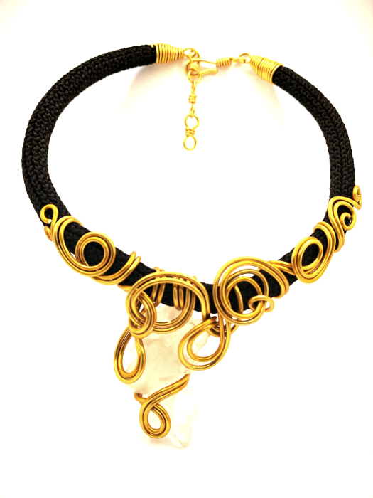 Pentru ca femeile cu personalitate puternica poarta bijuterii statement, am creat un colier unicat, lucrat manual din funie neagra, pusa in contrast cu claritatea cristalului de stâncă și accentele moderne ale firelor de aluminiuauriu. Designul imbina forta bruta a materialelor cu o estetica contemporana, rezultand o piesa expresiva, cu personalitate. Un accesoriu care atrage privirea si spune o poveste despre echilibru, energie si originalitate.