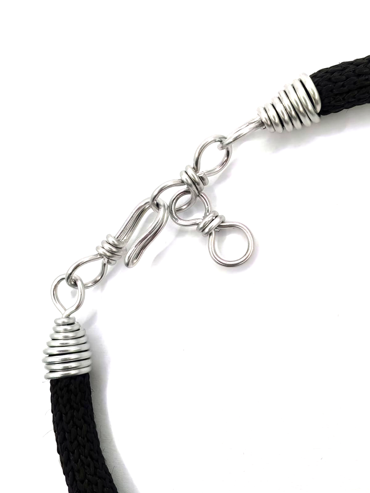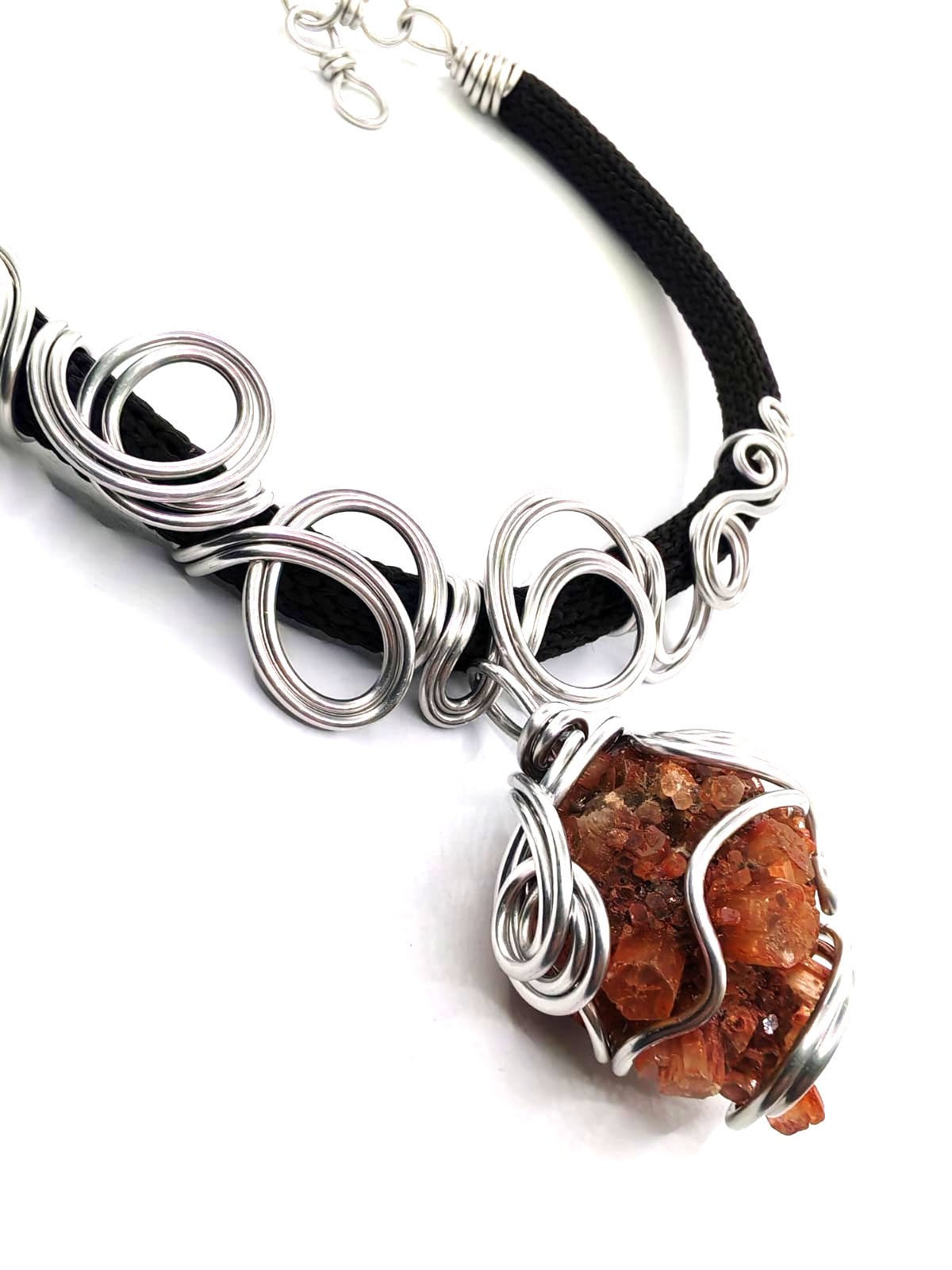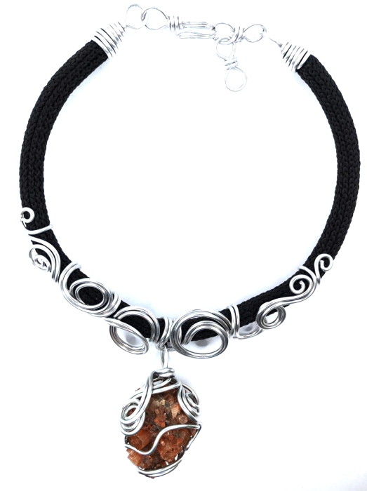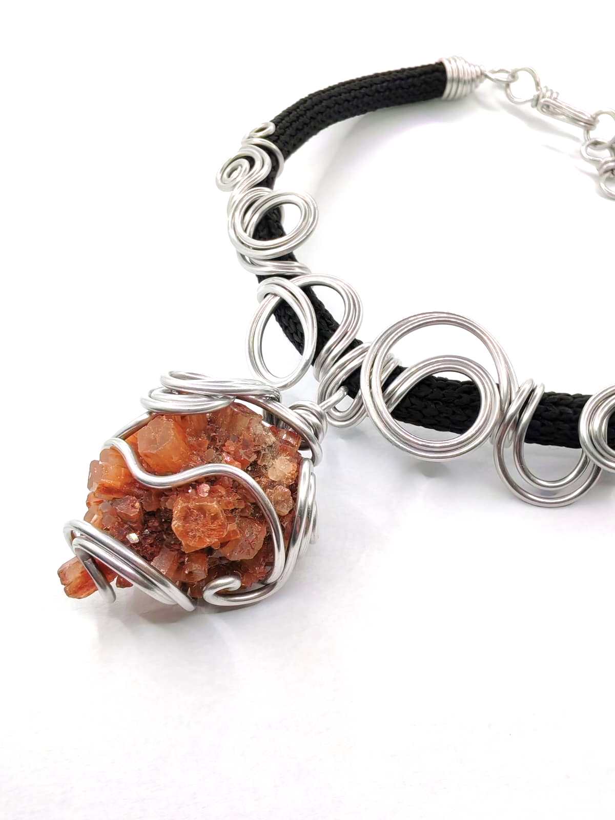 Colier realizat manual, cu funie neagra rezistenta si piatra bruta de aragonit, prinsa cu fir de aluminiu argintiu, modelat cu grija pentru a evidentia forma naturala a pietrei. Fiecare colier este unic, pastrand energia si frumusetea autentica a mineralului.