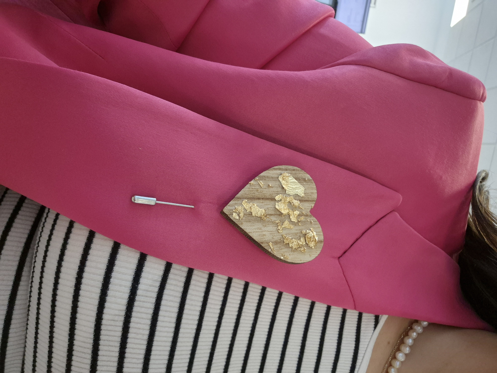 Accesoriul este prevazut cu un ac de brosa metalic rezistent, ușor de prins pe haine, esarfe sau genti. Fiecare brosa este unică datorita texturii naturale a lemnului si distributiei foitei de aur, devenind astfel o mica opera de arta purtabila — perfecta pentru cei care apreciaza frumusetea obiectelor handmade.