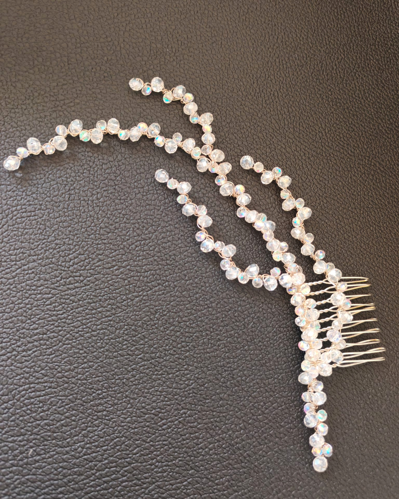 Accesoriu de par delicat pentru mirese, realizat manual din fir placat cu argint, cu baza tip pieptan pentru o fixare sigura si confortabila. Cristalele fine sunt modelate in forma de crengute elegante, inspirate din frumusetea naturii, oferind un aer romantic si rafinat. Ideal pentru coafuri lejere, cocuri sau impletituri, acest accesoriu adauga stralucire subtila si completeaza perfect orice tinuta de nunta, transformand fiecare aparitie intr-un moment memorabil.
